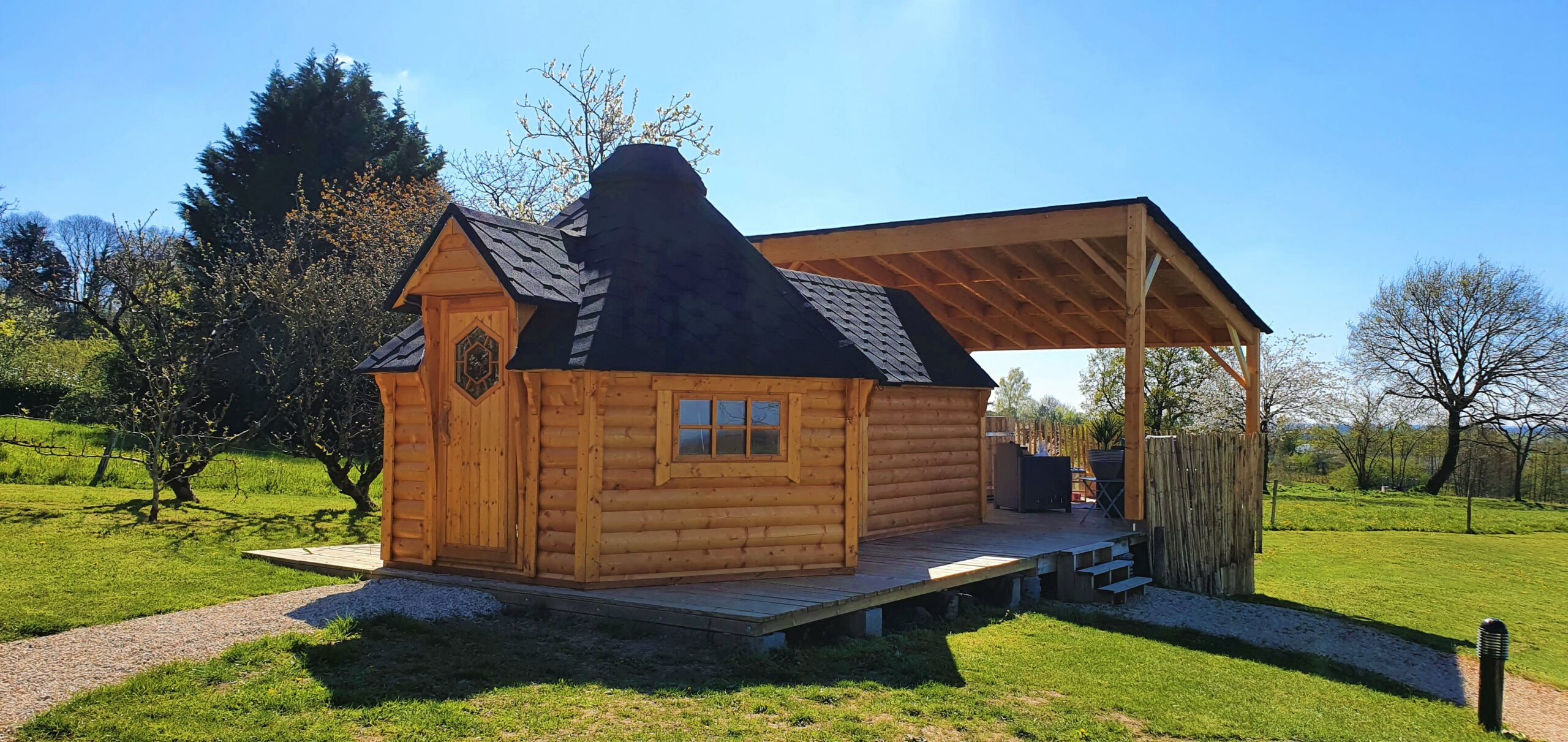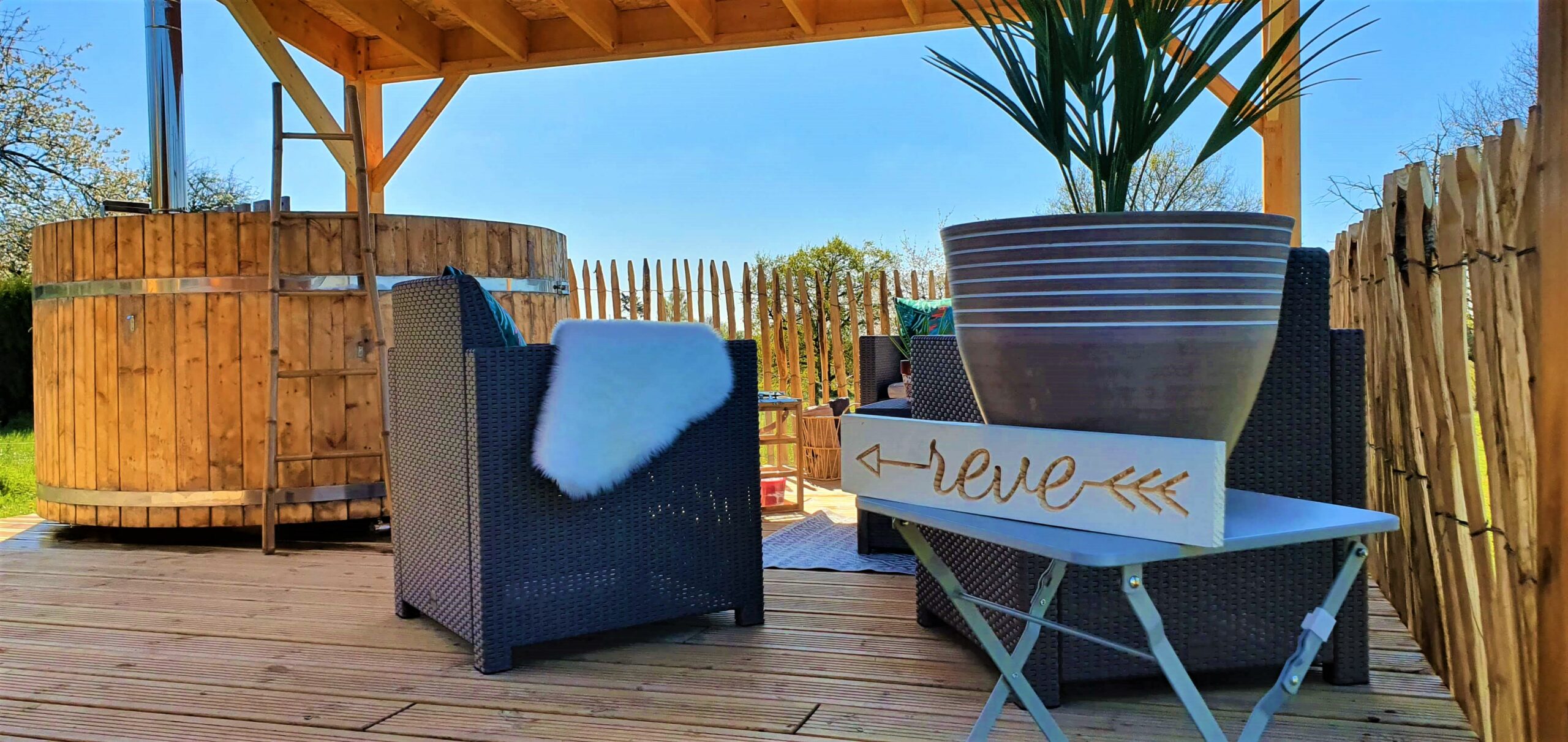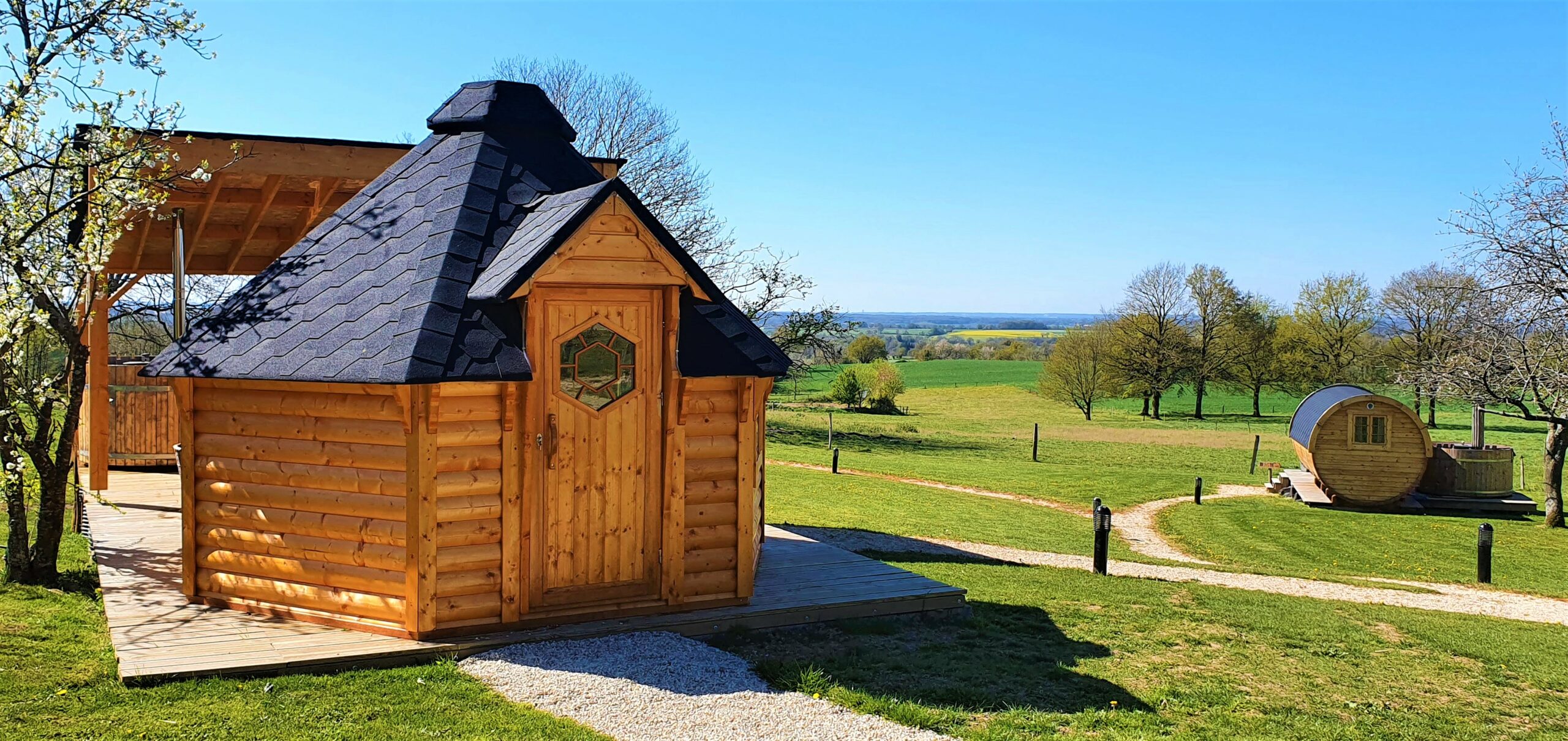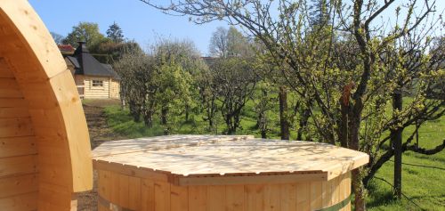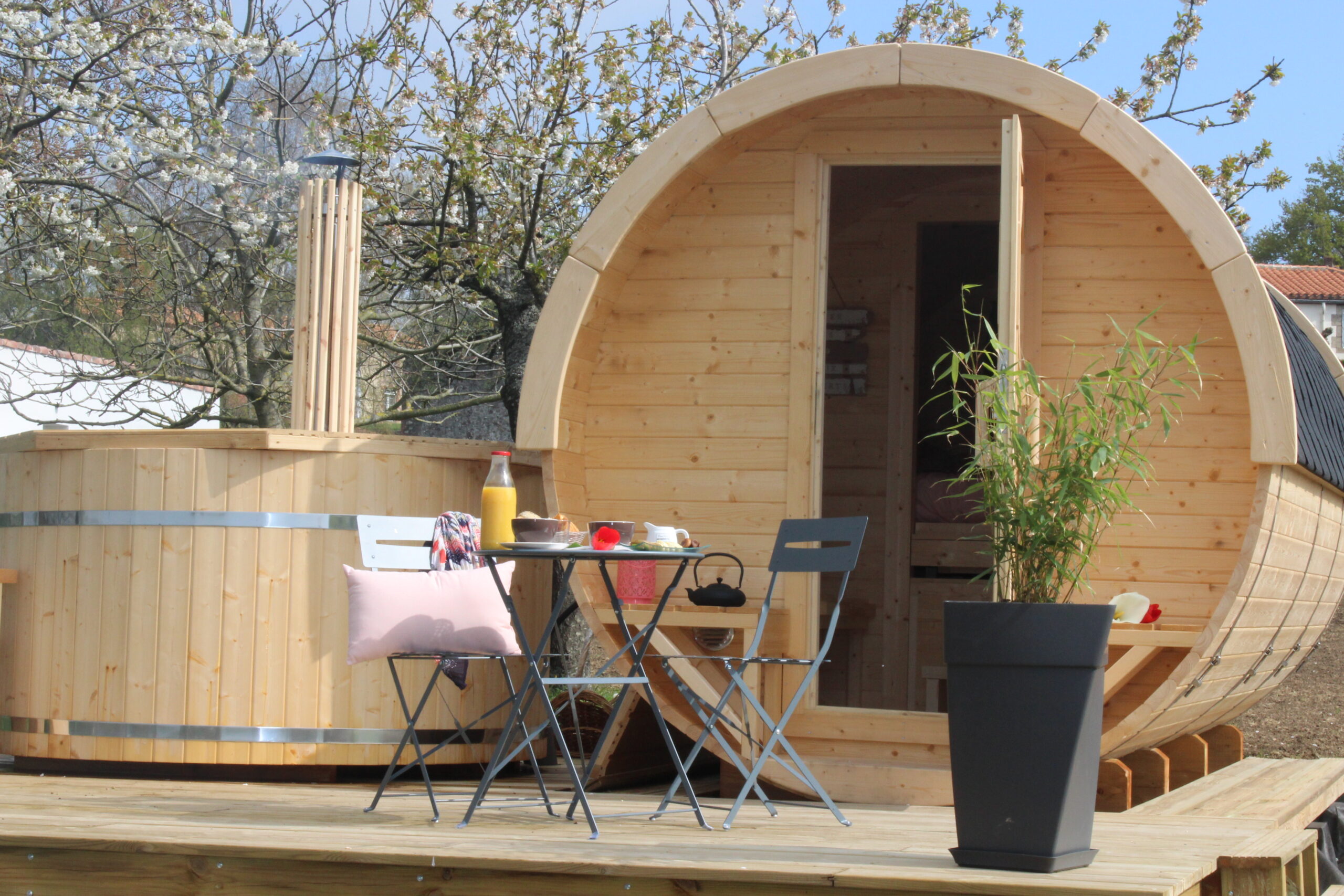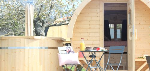 Un barrel pour 2 personnes avec bain finlandais + terrasse privative. Accès pod sanitaire avec votre cabine privative : douche, lavabo, wc.